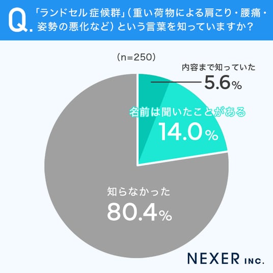 ランドセルの重さを気にする保護者は多いものの、それが「症候群」として定義されていることを知っている人は2割にも満たない結果となりました。