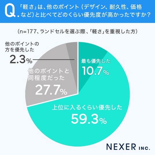 続いて、「軽さ」を重視した方に、他のポイント(デザイン、耐久性、価格など)と比べた優先度を聞いてみました。