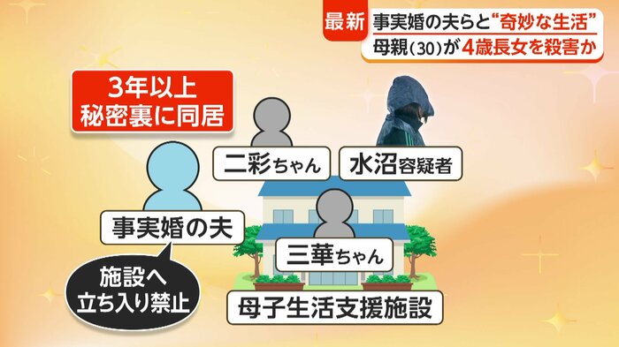 施設の近隣住民は「(施設に)男性が入っているのは見たことがない。母子しか入れないので(事実婚の夫が)出入りしていたら目立つと思う」などと話した。