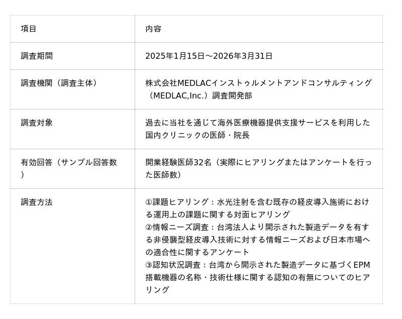 台湾法人より開示された製造データを有する非侵襲型経皮導入技術(EPM搭載機器等)について、国内医師の情報ニーズおよび日本市場への適合性に関するアンケートを実施しました。