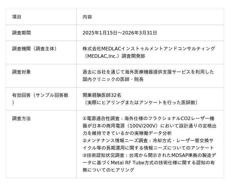 当社は、海外製医療機器情報提供事業者として、こうした情報の空白を埋め、国内医師がレーザー機器の導入・運用を検討する際に必要となる客観的な技術データを提供することを目的として、本調査を実施いたしました。