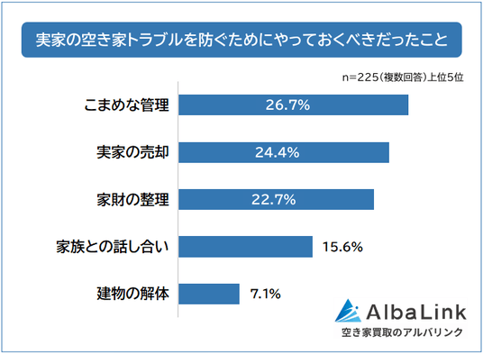 今回、株式会社AlbaLink( https://albalink.co.jp/ )が運営する空き家買取隊( https://akiya-kaitoritai.com/ )は、実家が空き家になった経験がある225人を対象に「実家の空き家でトラブルになったこと」についてアンケート調査を実施しました。
