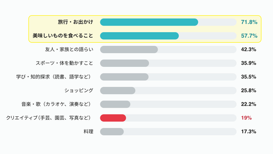 - 圧倒的な「外向き」志向一生楽しみたい趣味のトップは「旅行・お出かけ(71.8%)」。シニアのイメージとして描かれがちな「手芸・園芸などのクリエイティブ」は19.0%にとどまり、シニアの関心が強く「外(体験)」に向かっていることが判明。