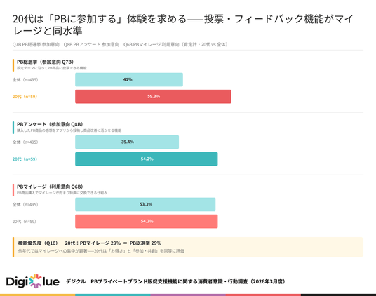 調査の結果、物価高を背景にPB購入が増加している消費者層において、マイレージ型の販促機能への需要が突出して高いことが明らかになりました。また20代を中心とした若年層では「商品開発への参加」という新しい購買体験への意欲が、マイレージ施策と同水準で評価されることも判明しました。