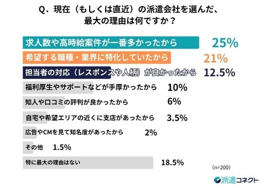 「Q.現在(もしくは直近で)利用している派遣会社を選んだ、最大の理由は何ですか?」という設問では、「求人数や高時給案件が一番多かったから」が25%と最多で、次に「希望する職種・業界に特化していたから」が21%と続きます。