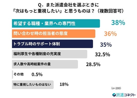 「Q.また派遣会社を選ぶときに、「次はもっと重視しておきたい」と思うものはどれですか?」という設問では、「希望する職種・業界への専門性」が38%、「問い合わせ時の担当者の態度」が36%、「トラブル時のサポート体制」が35%で、いずれも「求人数や高時給案件の量」の28.5%を大きく上回る結果となりました。