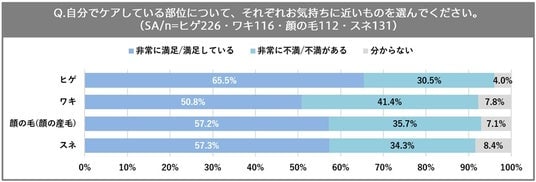 10~20代男性は、体毛のセルフケア派が多数派の一方で、セルフケア派の約3人に1人が自身のケアに「非常に不満/不満」と感じている結果に。
