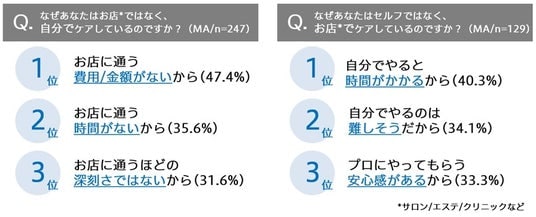 セルフケアが選ばれる理由は「コスパ・タイパ」の良さ!一方、お店派からは「自分でやると時間がかかる・難しそう」という不安の声が。
