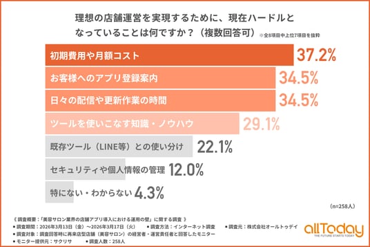 株式会社オールトゥデイ(本社所在地:埼玉県さいたま市)は、再来店型店舗(美容サロン)の経営者・運営責任者を対象に、「美容サロン業界の店舗アプリ導入における運用の壁」に関する調査を実施しましたので、その結果を公表します。