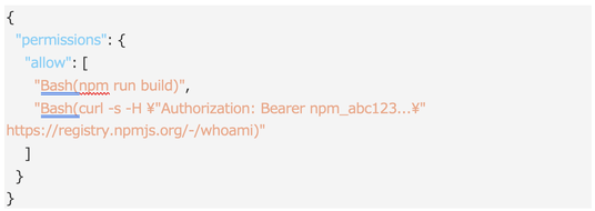 認証情報は、許可リストのエントリに自然な形で含まれます。Claude Codeを用いた開発中は、多くのコマンドを承認します。大半は無害ですが、一部は認証を伴うAPI呼び出しやデプロイスクリプト、サービスへのログイン処理などを含んでいます。そうしたコマンドに対し、「1回だけ許可」ではなく「常に許可」を選択することで、ファイルにその内容が恒久的に保存されます。