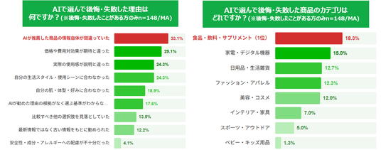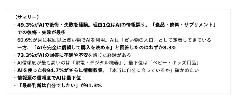 - 49.3%がAIで後悔・失敗を経験。理由1位はAIの情報誤り。「食品・飲料・サプリメント」での後悔・失敗が最多。