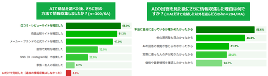 AIだけで完結した」のはわずか5.3%で、94.7%が買い物でAIを活用した後さらに情報収集をおこなっていることがわかりました。確認先として多かったのは「口コミ・レビューサイト(55.0%)」「商品比較サイト(51.3%)」「メーカー・ブランド公式サイト(47.0%)」。確認した理由として「本当に自分に合っているか確かめたかった(55.6%)」「他の選択肢も見たかった(46.5%)」「AIの回答に根拠が感じられなかった(31.3%)」が上位に挙がりました。