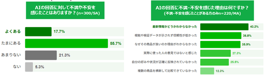 73.3%がAIの回答に不満や不安を感じたことがあると回答。理由1位は「最新情報かどうかわからなかった(43.2%)」で、次いで「根拠や検証データが示されず信頼性が低かった(36.8%)」、「なぜその商品が良いのか理由がわからなかった(35.9%)」という結果に。