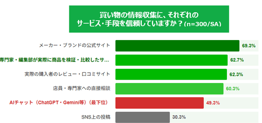 - 情報源の信頼度でAIは最下位。消費者の信頼が高いのは「メーカー・ブランドの公式サイト」