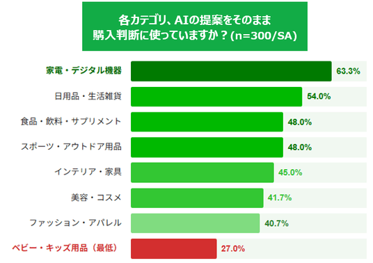 - AI信頼度が最も高いのは「家電・デジタル機器」、最下位は「ベビー・キッズ用品」