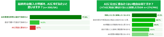 「最終的な購入判断をAIに委ねたい」と回答したのは8.7%にとどまり、91.3%が「自分で判断したい」と回答。AIに委ねたくない理由として「失敗したときに後悔したくないから(41.2%)」「AIが間違える可能性があると思うから(35.4%)」「自分の好みや状況はAIに完全には伝わらないと思うから(38.7%)」が上位に挙がりました。