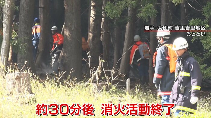 約15kgの水を担ぎ消火にあたる消防団員たち。火は約30分後に消し止められました。
