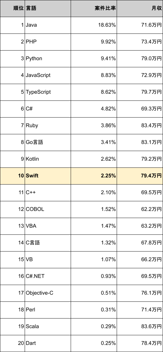 2026年4月時点でSwiftの案件は市場全体の2.25%を占め、案件数は10位、平均月額単価は79.4万円と高い水準を維持しています。