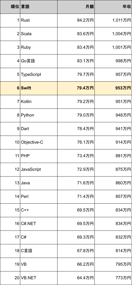 Swift案件の平均月額単価は79.4万円、平均年収は953万円で、プログラミング言語別の年収ランキングでは6位に位置しています。