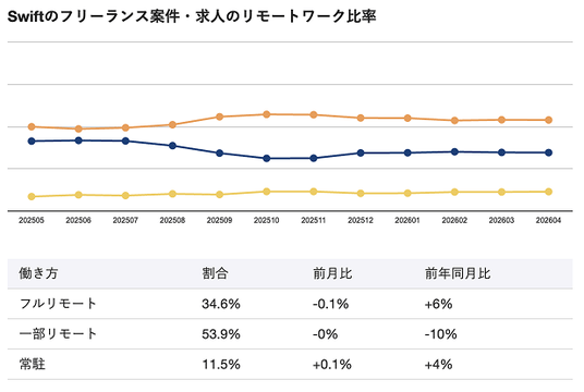 2026年4月時点のSwift向けフリーランス案件・求人におけるリモートワーク比率は、フルリモートが34.6%、一部リモートが53.9%、常駐が11.5%となっています。
