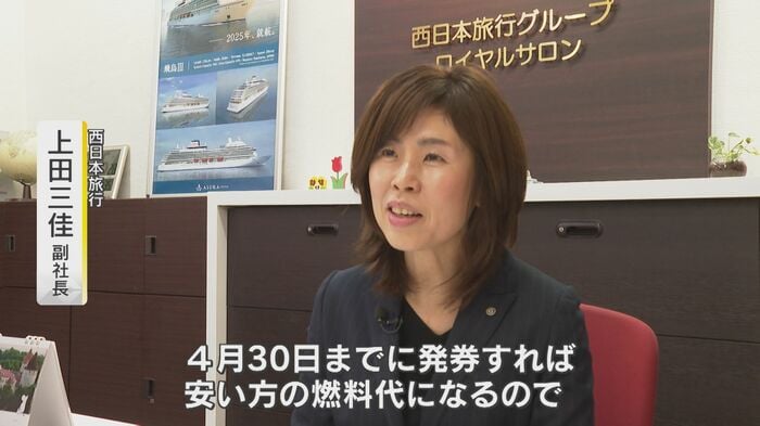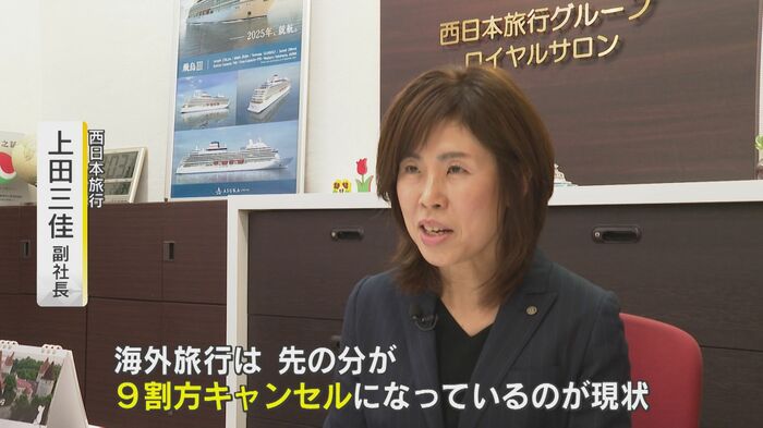 「海外の旅行に関しては、先の日程分が9割方キャンセルになってきているのが現状。遠方のみならず、近くの韓国とか、そういった所のお客様も戦争という状況下で、行き先を国内にスライドして行こうという動きの方が多い」と『西日本旅行』の上田三佳副社長は説明する。