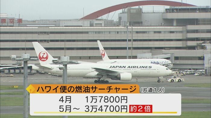 例えば、日本航空でハワイに行く場合、4月の燃油サーチャージは、片道1人1万7800円だが、5月以降は2倍近い3万4700円となる。