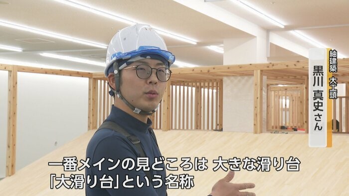 大工頭の黒川真史さんは、完成した遊具を目の前にして「改めて大きいなと思った。すごい感動」と話す。遊具には「大滑り台」と呼ばれるメインの滑り台のほか、小・中の2種類の滑り台、ボルダリング、ロープを使いながら登るエリアなど、「登る、くぐる、渡る、滑る」の多様な遊び方が詰め込まれている。