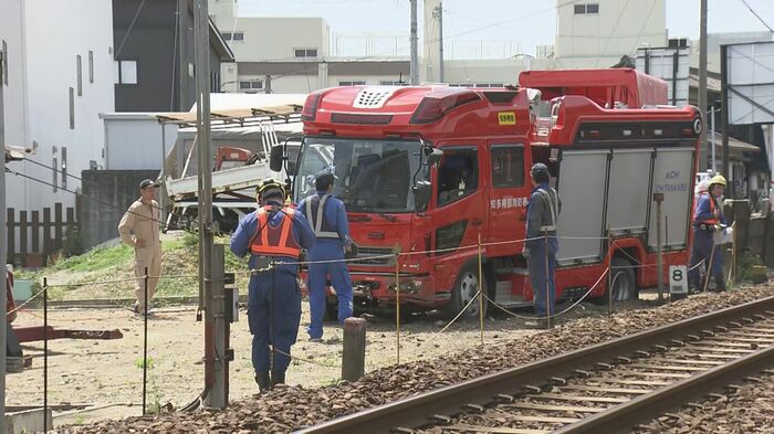 武豊町の線路沿いに止まった消防車の脇で、警察官に取り押さえられた男。