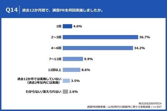 「Q14. 過去12か月間で、調査PRを何回実施しましたか。」(n=547)と質問したところ、「1回」が4.6%、「2~3回」が36.7%という回答となりました。