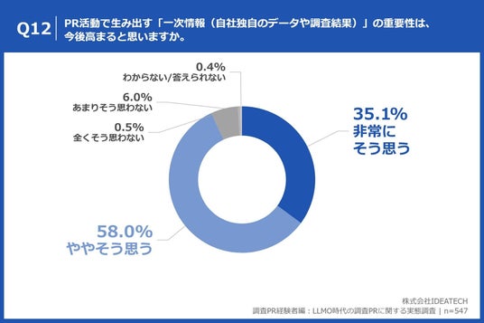 「Q12. PR活動で生み出す「一次情報(自社独自のデータや調査結果)」の重要性は、今後高まると思いますか。」(n=547)と質問したところ、「非常にそう思う」が35.1%、「ややそう思う」が58.0%という回答となりました。