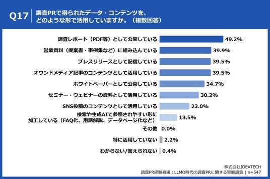「Q17. 調査PRで得られたデータ・コンテンツを、どのような形で活用していますか。(複数回答)」(n=547)と質問したところ、「調査レポート(PDF等)として公開している」が49.2%、「営業資料(提案書・事例集など)に組み込んでいる」が39.9%、「プレスリリースとして配信している」が39.5%という回答となりました。