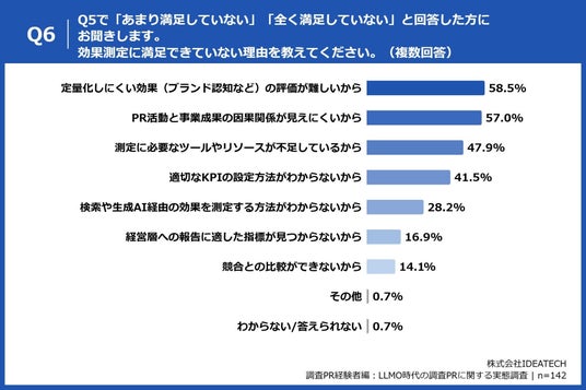 「Q6. Q5で「あまり満足していない」「全く満足していない」と回答した方にお聞きします。効果測定に満足できていない理由を教えてください。(複数回答)」(n=142)と質問したところ、「定量化しにくい効果(ブランド認知など)の評価が難しいから」が58.5%、「PR活動と事業成果の因果関係が見えにくいから」が57.0%、「測定に必要なツールやリソースが不足しているから」が47.9%という回答となりました。