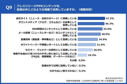 「Q9. プレスリリースやPRコンテンツを、配信以外にどのような場面で活用していますか。(複数回答)」(n=547)と質問したところ、「自社サイト(ニュース・お知らせページ)に掲載している」が47.3%、「オウンドメディア(ブログ、コラムなど)の記事として活用している」が46.3%、「SNS投稿のコンテンツとして活用している」が43.0%という回答となりました。