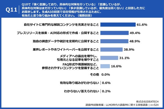「Q11. Q10で「強く意識しており、具体的な対策を行っている」「意識しているが、具体的な対策はまだ行っていない」「多少意識しているが、優先度は高くない」と回答した方にお聞きします。生成AIの回答で自社情報が引用されるために、有効だと思う取り組みを教えてください。(複数回答)」(n=524)と質問したところ、「自社サイトに専門的な解説コンテンツを充実させること」が61.6%、「プレスリリースを検索・AI対応の形式で作成・公開すること」が49.4%、「独自の調査データや統計を定期的に公開すること」が48.9%という回答となりました。