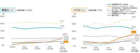 いずれにおいても、情報収集の複線化が進んでいますが、その変化の程度はペアローン世帯の方が大きくなっています。ペアローンは契約に関わる主体が複数となることもあり、単独ローンに比べて、より多角的に情報を収集しながら検討が進められているものと思われます。