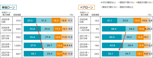 一方で、住宅ローン検討時により多くの情報源を活用し、かつ頭金ゼロを選択する割合も足元では減少してきています。借入れだけに依存するのではなく、自己資金の準備を含めて住宅取得に向き合う姿勢がみられる点は、これまでのイメージとは異なる側面ではないでしょうか。