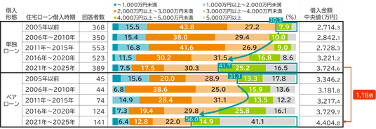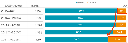 2021年~2025年の借入れではペアローンの利用割合は22.0%となり、20年前と比べて約2倍になりました(図表1)。現在も単独ローンが多数派ではあるものの、ペアローンによる住宅取得も一定の割合で定着してきている状況が見て取れます。