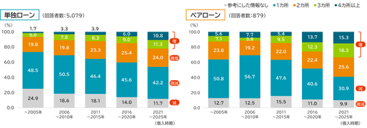 ペアローン世帯においては、「1カ所のみ」を参考にした割合が減少し、「3カ所以上」の割合が高まっています。