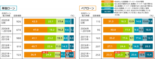続いて、家計管理の形態を確認しました。設問の選択肢を「単独管理」「主体者あり共同管理」「共同管理」「独立管理」の4つのスタイルに大きく分けてみると、いずれのローン形態でも「単独管理」が減少しているものの、単独ローン世帯(2021年~2025年)は、依然として「単独管理」(36.9%)が最も多く、次いで「主体者あり共同管理」(36.3%)となっています(図表4)。