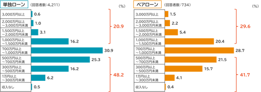 ただし、700万円未満の割合は単独ローン世帯48.2%、ペアローン世帯41.7%である一方、1,000万円以上の割合は単独ローン世帯20.9%、ペアローン世帯29.6%となっており、ペアローン世帯では高収入層の比重がやや高い結果となっています。