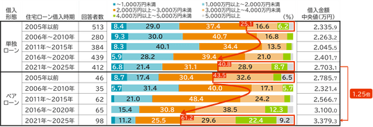 以上の項目には違いがみられた一方で、「借入期間」「返済比率」「借入金利」については、単独ローンとペアローンに共通した傾向が確認されました。