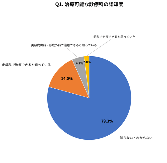約8割の方がまぶたのぶつぶつの治療先を把握していないことが判明しました。また、2.0%の方は眼科で治療できると誤解しており、適切な診療科への認知が進んでいない現状が明らかになりました。