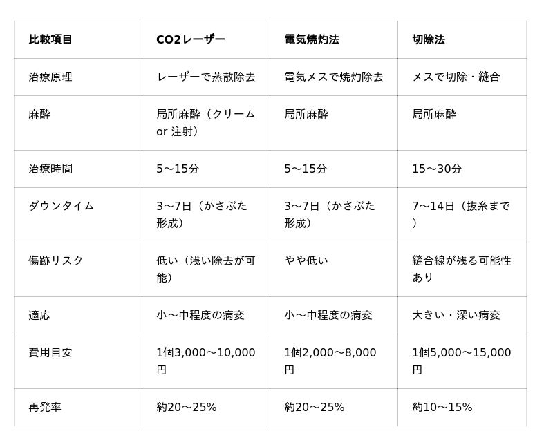 最も一般的なのはCO2レーザー(炭酸ガスレーザー)による蒸散法で、局所麻酔下で5~15分程度の施術です。当院監修医師の2,000件以上の治療実績によると、78.0%の方が再発なく経過しています。電気焼灼法も同様に有効で、費用面ではやや低価格です。大きな病変や深い病変には切除法が適応となることもあります。