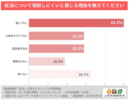 相談しにくい理由として最も多かったのは「話しづらい」43.5%、続いて「心配をかけたくない」25.2%、「温度差がある」25.2%、「理解されない」16.5%という結果でした。妊活は身体や将来設計に関わるデリケートな話題であるうえ、相手との温度差や比較への不安が重なり、“話したいのに話しづらい”状態を生みやすいことがうかがえます。