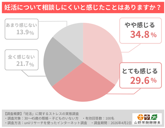 「妊活について相談しにくいと感じたことはありますか」という設問では、「とても感じる」29.6%、「やや感じる」34.8%で、合わせて64.4%にのぼりました。一方で、「あまり感じない」は13.9%、「全く感じない」は21.7%でした。相談のしにくさが一部の人だけのものではなく、多くの人に共通する感覚になっていることが見て取れます。