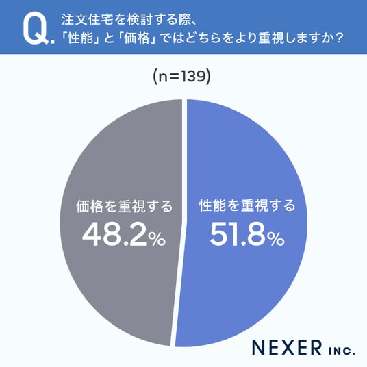 続いて、注文住宅を検討する際に「性能」と「価格」のどちらをより重視するかについて聞いてみました。