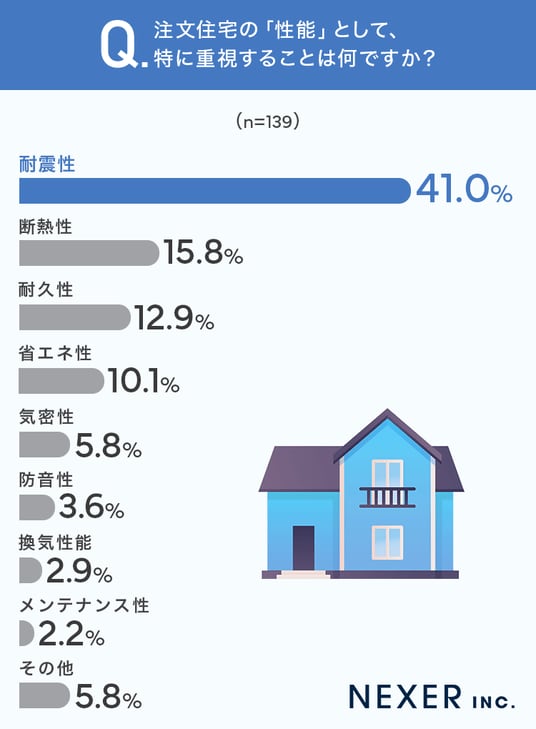 ■41.0%が、注文住宅の性能で最も重視するのは「耐震性」と回答