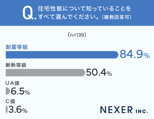 「耐震等級」の認知度が84.9%と突出して高く、次いで「断熱等級」が50.4%、「UA値」が6.5%、「C値」が3.6%という結果になりました。