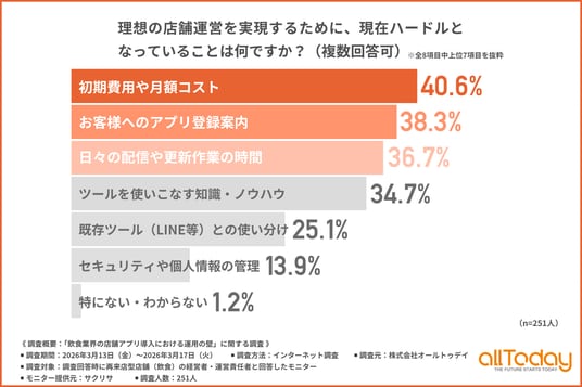 株式会社オールトゥデイ(本社所在地:埼玉県さいたま市)は、再来店型店舗(飲食)の経営者・運営責任者を対象に、「飲食業界の店舗アプリ導入における運用の壁」に関する調査を実施しましたので、その結果を公表します。