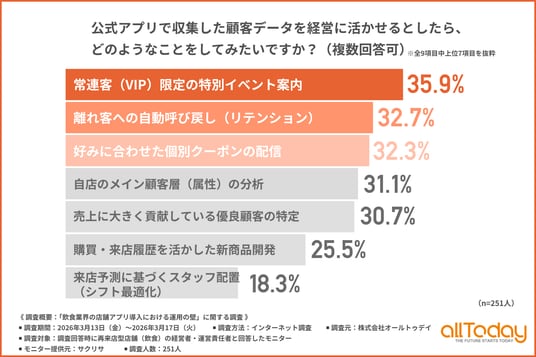 「公式アプリで収集した顧客データを経営に活かせるとしたら、どのようなことをしてみたいか」と尋ねたところ、『常連客(VIP)限定の特別イベント案内(35.9%)』と回答した方が最も多く、『離れ客への自動呼び戻し(リテンション)(32.7%)』『好みに合わせた個別クーポンの配信(32.3%)』となりました。